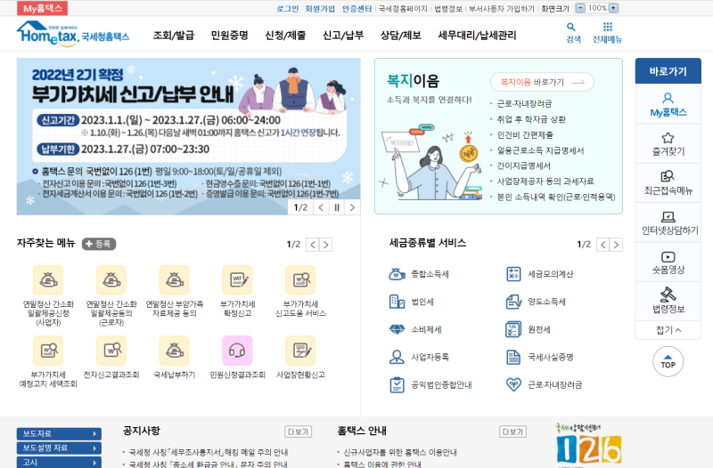 국세청 홈택스1/1 자주찾는 메뉴1/2년말 조정 간소화 자료조회(근로자) 사업장현황신고 부가가치세 기한후 신고 부가가치세 신고지원서비스 양도소득세 예정신고(주식 등) 전자신고결과조회 국세납부(납부할 세액조회납부) 세금포인트조회 민원신청결과조회 현금영수증 발급편리한 연말정산 연말정산 부양가족자료제공 동의 현금영수증 매출내역 누계조회 현금영수증 매입세액공제확인/변경 신용카드 매출자료조회 사업용 신용카드 매입세액확인/변경 화물운전자 복지카드 매입세액확인/변경 전자세금계산서 발행…www.hometax.go.kr