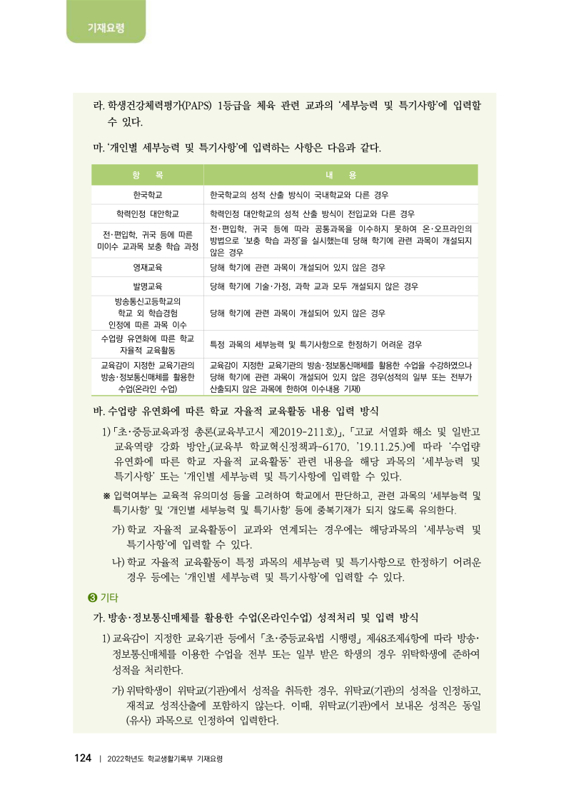 개인별 특수교육을 위한 2024년 학교기록부 작성 안내 : ‘유연한 수업일정에 따른 학교 자율적 교육활동’을 개인별 세부 능력과 특기에 기재합니다. 이는 특정 과목의 세부적인 능력이나 전문성에 대한 내용을 제한하기 어려운 경우에 적용된다.