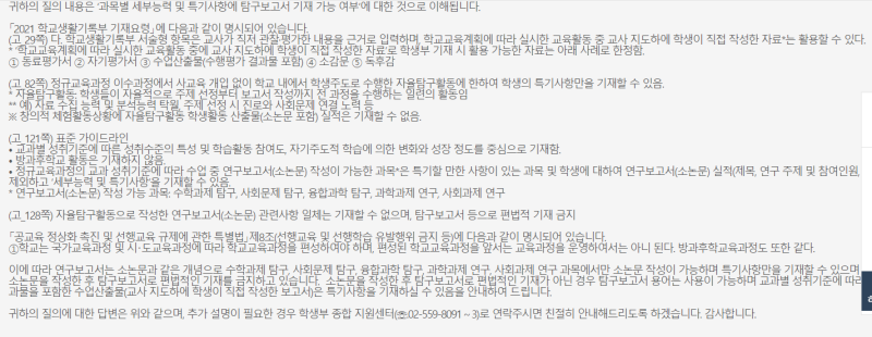각 개인의 특별한 정보를 입력하는 책임자는 담임교사입니다. 입력하고 나면 개별 세금 특별 세부 사항이 출생 증명서 하단에 표시됩니다. 주제의 제목 없이 처음으로 나타나는 부분은 개별 세부정보입니다. 개인별 입력량은 1500바이트(공백 제외 500자)로 교과서 사양과 동일하다. 개인세금 특별 주의사항 : 당연하지만, 대상세금 내용과 중복되지 않도록 주의해야 합니다. 수상, 공모전 등 학생기록에 기재할 수 없는 정보는 세금기록에 기재할 수 없습니다. 수상 및 공모전 세제혜택 중복입력 시 주의사항