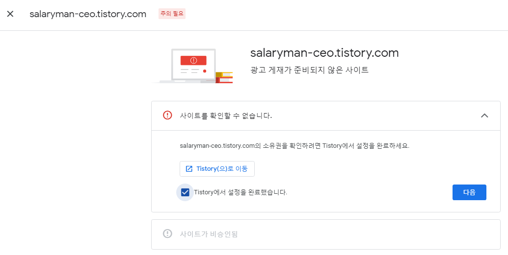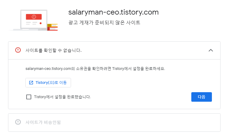 – ‘사이트가 광고를 표시할 준비가 되지 않았습니다’, ‘사이트를 확인할 수 없습니다’와 같은 경고 메시지가 표시됩니다.