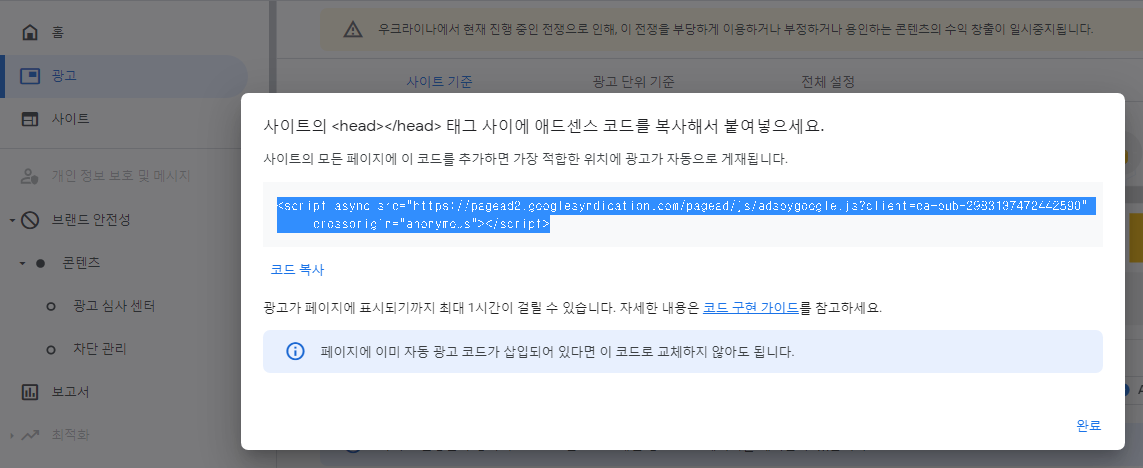 우선 애드센스 코드를 복사해서 추가하겠습니다. .