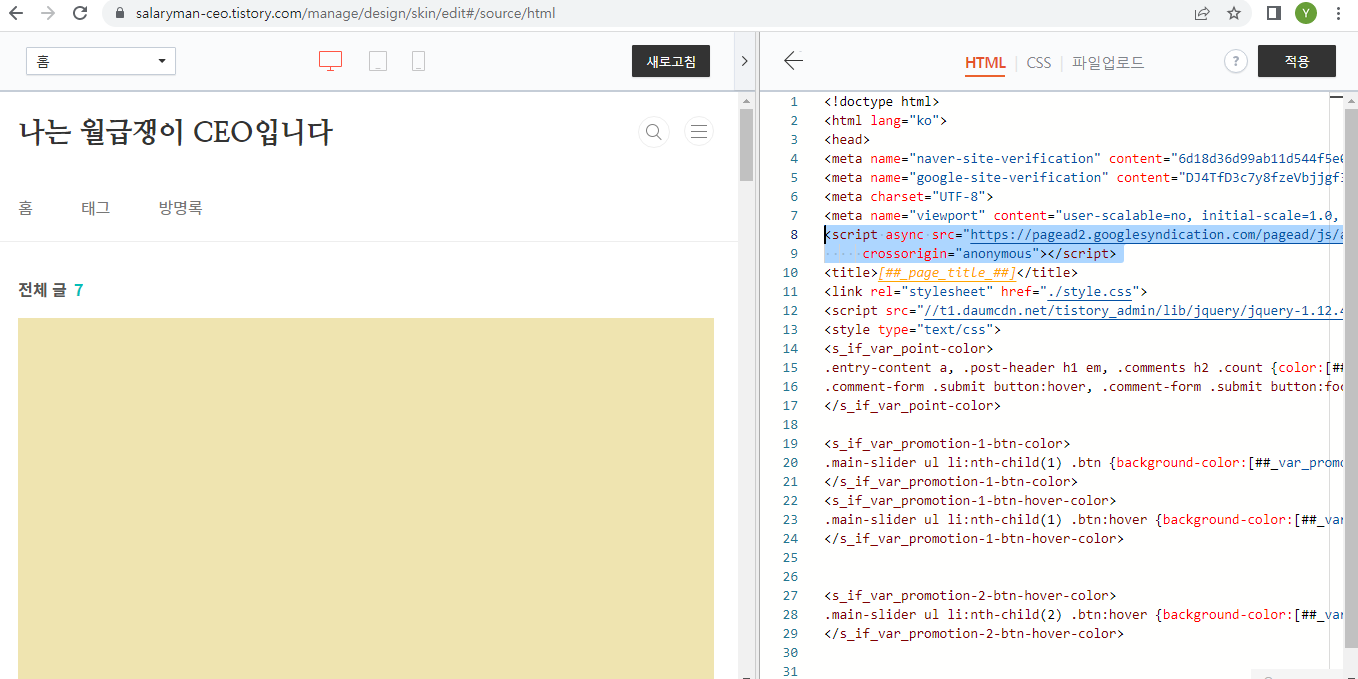 블로그의 어떤 부분이 문제일까 고민하다가 ‘내가 HTML에 애드센스 코드(스크립트)를 추가하지 않은게 문제가 아닐까?’
