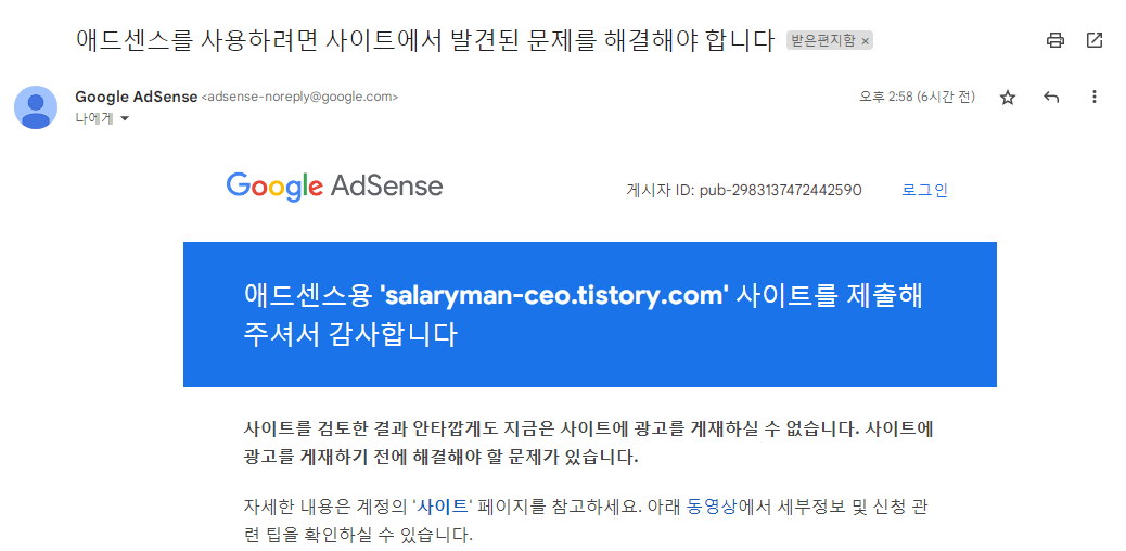 이후 블로그 수익화의 가장 중요한 관문인 ‘구글 애드센스’를 신청했다. 오늘 승인 거부 이메일을 받았습니다.