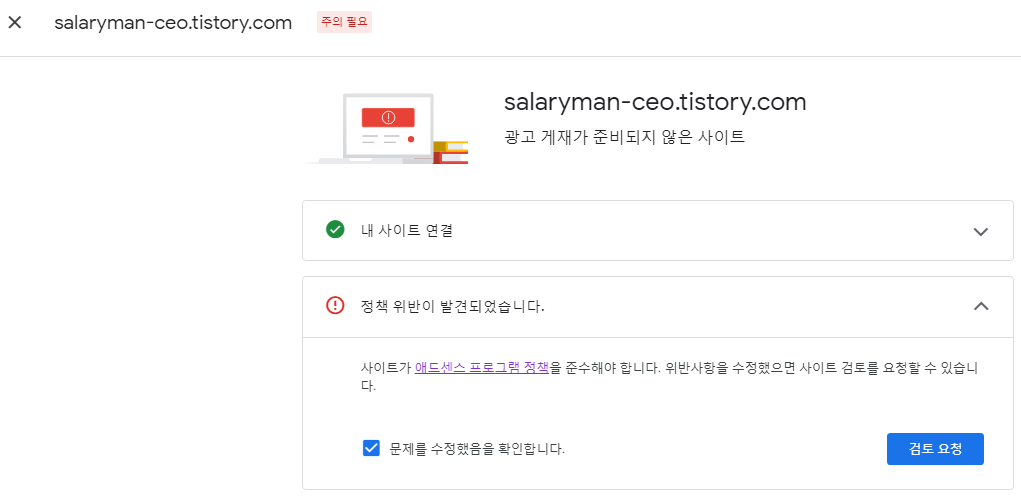 – 애드센스 접속 시 ‘일부 콘텐츠를 수정해야 합니다.’라는 사이트 오류가 발생합니다.