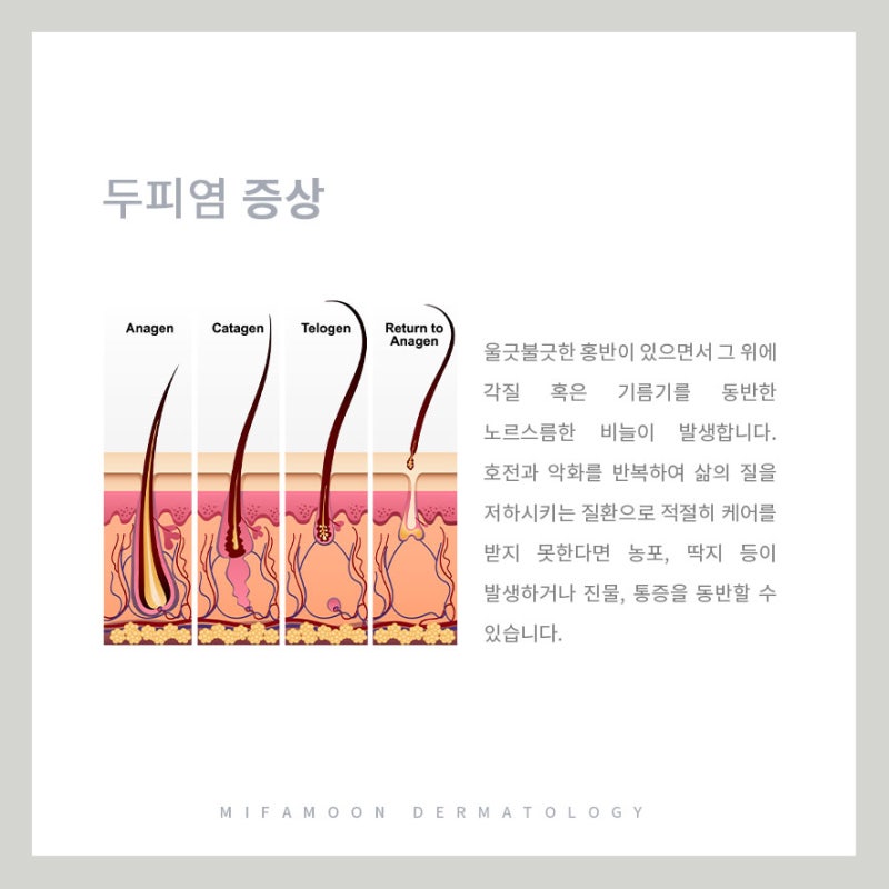 두피 염증을 대표하는 질환은 지루성 두피염과 털 낭염입니다.지루성 두피염은 장기간 계속되는 습진의 일부로, 피지선의 활동이 활발하게 일어나는 두피에 발생하는 만성 염증성 두피 염증 질환으로, 이것은 지루성 습진이라고도 불립니다.지루성 두피염은 붉은 반점이다 홍반과 가는 린설, 즉 비듬이 주요 증상으로 나타나지만 생후 3개월 이내, 40~70세 사이에 발생 빈도가 가장 비싸지만 현대 사회에 들어 성별과 연령을 불문하고 많은 환자가 발생하고 있습니다.사람의 몸에는 피지선이 분포하고 있는데요, 머리, 두피에는 특히 피지선이 분포하고 있습니다.그러나 심한 스트레스 같은 여러 요인에 의해서 호르몬의 불균형을 초래하고 신경 전달 물질의 이상이 생기고, 피지선의 활동이 활발하게 이뤄지며 많은 피지를 분비합니다.피지에 의해서 모공이 막혀서 혈액 순환이 원활하지 않고 두피에 열감이 오르는데 열이 오른 두피는 건강에 좋지 않고 일하다, 각종 질환과 함께 지루성 두피염이 발생합니다.털 낭염은 잘 뾰루지라고 불리는데요, 세균 감염으로 피부에 고름이 든 부대가 수 있는 질환으로 피부 표면에만 발생하고 마오 주머니에만 영향을 미칠 수도 있지만 더 깊은 피부의 구조에까지 영향을 미칠 수 있습니다. 보통 털 노우염의 한 부위가 가렵고 아프며 좁쌀같이 누렇고 곪은 형태로 나타납니다. 모포을 중심으로 붉은 반점이 생기는 작은 입 발질 또는 농포가 생기면 딱딱한 통증이 심한 홍색 결절이 나타납니다.