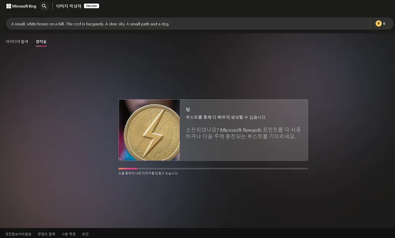 이미지를 생성할 때마다 검색창 옆의 부스트가 1씩 감소합니다. 스탠드를 사용하면 이미지를 빠르게 생성할 수 있습니다. 부스트가 소진되면 Edge 브라우저를 더 많이 사용할수록 누적되는 Microsoft Rewards 포인트로 충전하고 매주 자동으로 충전될 때까지 기다립니다.