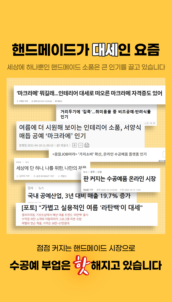 판매를 시작하기 위해 모든 강의를 들을 필요는 없기 때문에 어느 정도 실력을 쌓은 후 바로 판매를 시작했습니다. 판매는 제품을 만드는 것보다 쉽고 간단했습니다. 내가 수작업을 하는 곳이 모든 판매 루트를 제공한다. 별도의 웹사이트를 만들어야 합니다. 귀하가 제공하는 쇼핑몰에 판매할 상품을 업로드하시면 네이버, 쿠팡, 11번가 등 대형 오픈마켓에 자동으로 노출됩니다. 상품 등록 방법도 판매하고 싶은 상품을 사진, 설명, 가격과 함께 나열하는 것입니다. 입력하고 업로드만 하면 끝 🙂