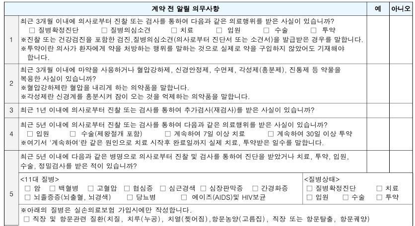 @보장 내용 뇌 혈관 11천만원이 뇌 혈관 21천만원 심혈관 질환 11천만원 심혈관(I49)500만원 심혈관(주요 염증)천만원 심혈관 질환 21천만원 혈전 용해제(I63/I21)각각 1천만원 씨 수술비/N 대수술비를 포함한 A사는 마음/뇌 혈관 수술비가 있습니다.그럼에도 불구하고 N 대수술비를 제안한 이유는 2 큰 수술비만 가지고 나가기보다는 그 보험료로 24대 질병 수술비를 보장된 것이 좋았어요.마지막 한가지 이 분의 통보는 3.5.5간편 고지입니다.40대 여성 간편 355프랑, 3개월 이내에 입원, 수술, 다시 검사가 필요하다고?5년 이내에 병/상해에서 입원 또는 수술?5년 이내에 8대 질병(암, 백혈병, 협심증, 심근 경색, 심장 판막증, 간 경변증, 뇌졸중, 에이즈)의 진단을 받거나 입원 또는 수술?이 분은 고혈압 약과 고지혈증의 약만 먹고 있다는데, 진찰 중에 다른 입원/수술 경험도 나왔습니다.그러나 이 회사는 5년 이내에 입원 또는 수술이 있는 경우도 보험 가입이 가능한 예외 질환을 폭넓게 운영하고 있습니다.202개 경증 질환에 대해서는 14일 이내에 입원, 최대 3회 수술까지는 고지 사항에 해당되더라도 제한 없이 가입이 가능합니다.그래서 다른 유병자의 상품보다 싸게 가입할 수 있었습니다.