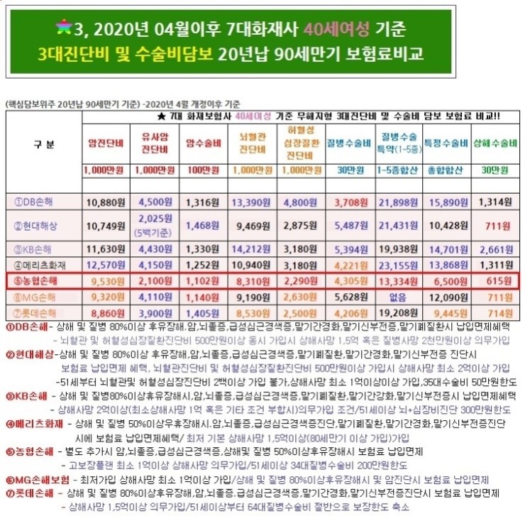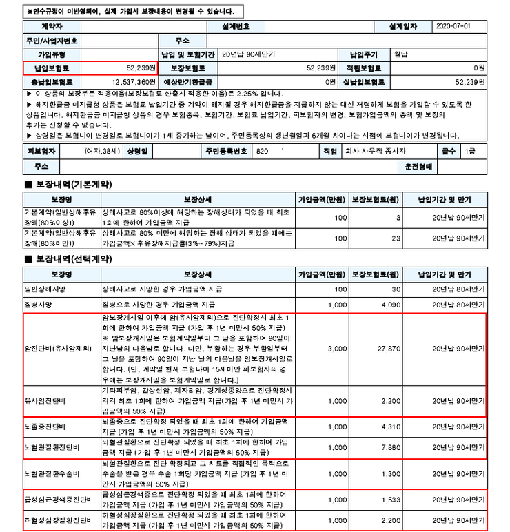 뇌경색 또는 급성심근경색으로 진단되어 용해제를 투여하는 경우에만 지급됩니다.또한 항응고제(헤파린 등) 및 경구용 약제기계적 혈전제거술(카테이터 등)은 제외됩니다.# 수술비, 수술비는 회사마다 다를 수 있습니다.그러니 잘 확인하고 가져가셔야 합니다.40대 초반 여성분들의 제안서를 확인해 보겠습니다!@ 가입내용 20년납 90세만기 무해지환급형플랜 한달 보험료 : 54,290원