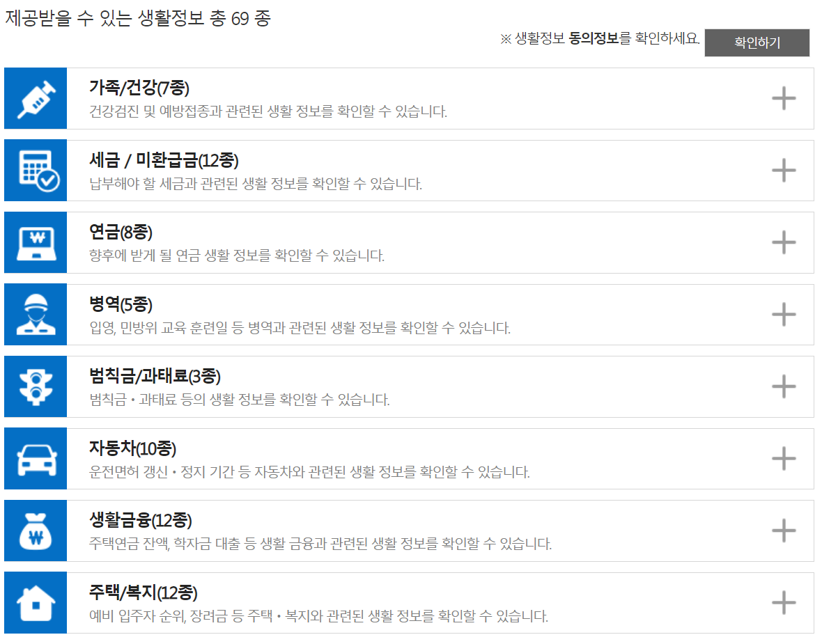 - 주택/복지 : 근로장려금 수급자, 자녀수급자, 여권만료일자, 거주예정자순위, 출입국사실확인서, 개인통관고유부호, 주민등록증분실조회