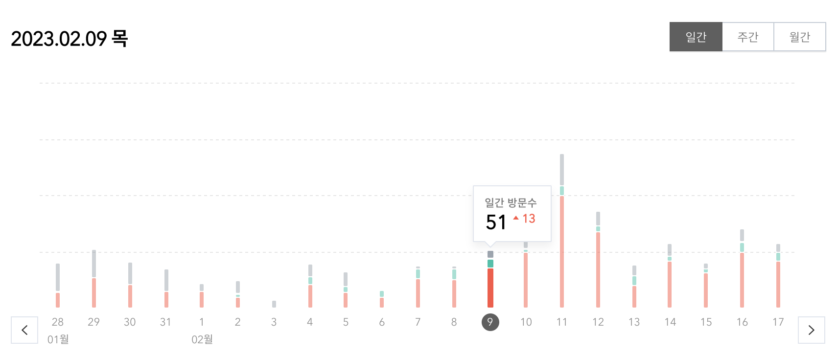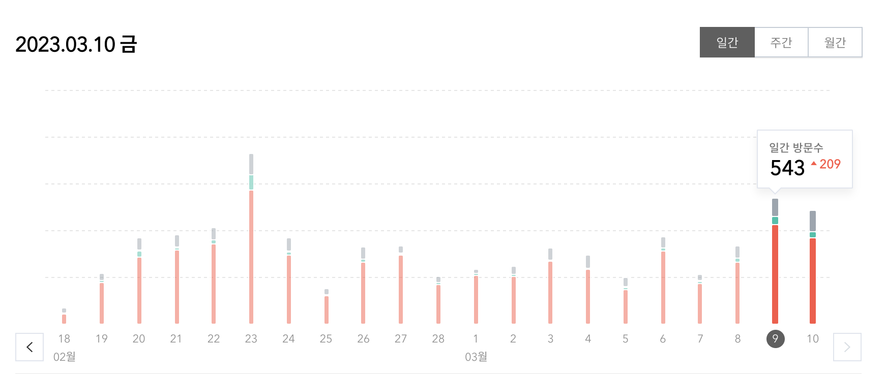 3월 9일 현재 약 500건의 유입이 있고, 최고는 700건이며, 2월 23일부터 매주 2,000건의 조회수가 지속적으로 발생하고 있습니다(하루에 2,000건의 조회수가 흐를 때까지.. ).
