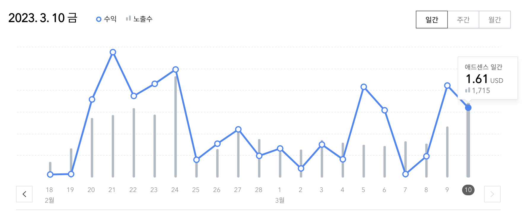 2월 9일부터 포스팅을 시작했고 한 달 뒤인 3월 10일에 얼마를 벌 수 있었는지 중간점검 시간을 가졌습니다.
