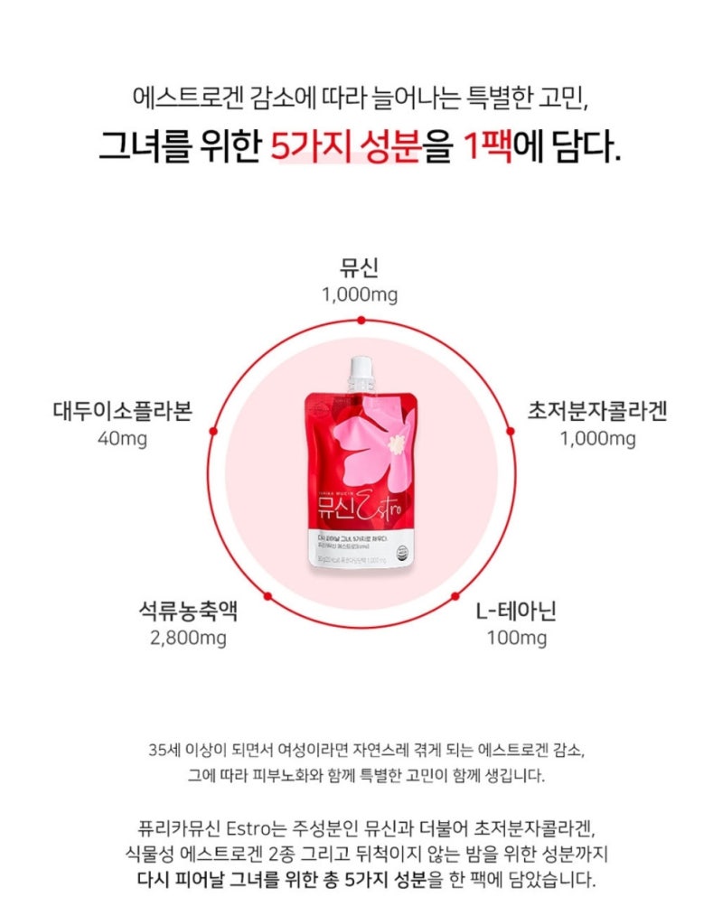 최고 함량으로 집중케어가 가능한 퓨리카뮤싱로! 특허받은 무신 복합추출물 1200mg 초저분자 피쉬콜라겐 펩타이드 1000mg 프락토올리고당(프리바이오틱스) 1000mg 부원료로 히알루론산, 엘라스틴, 비타민C가 함유되어 있습니다.35세 이상 집중 충전을 원하시는 분은 뮤싱글로우를 권장합니다:)