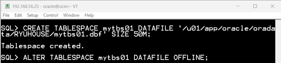 CREATE TABLESPACE mytbs01 DATAFILE '/u01/app/oracle/oradata/RYUHOUSE/mytbs01.dbf' SIZE 50M;