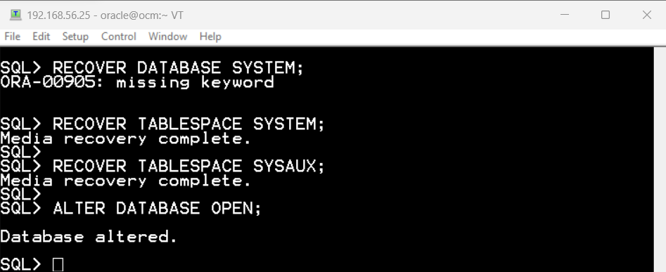 4. 테이블스페이스를 RESTORE한 후 데이터베이스를 OPEN합니다.
