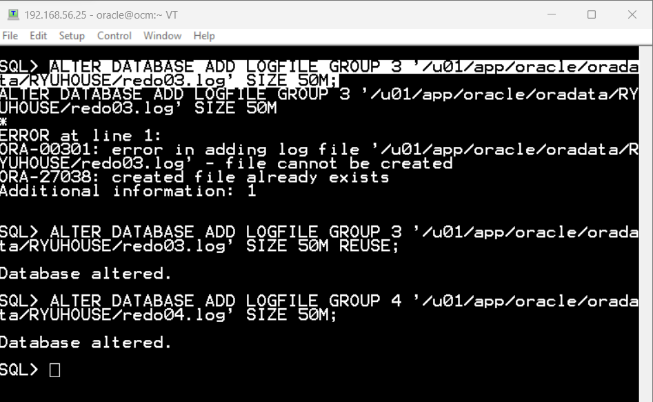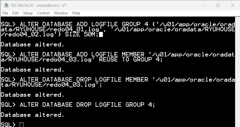 ALTER DATABASE ADD LOGFILE GROUP 4 '/u01/app/oracle/oradata/RYUHOUSE/redo04.log' SIZE 50M;
