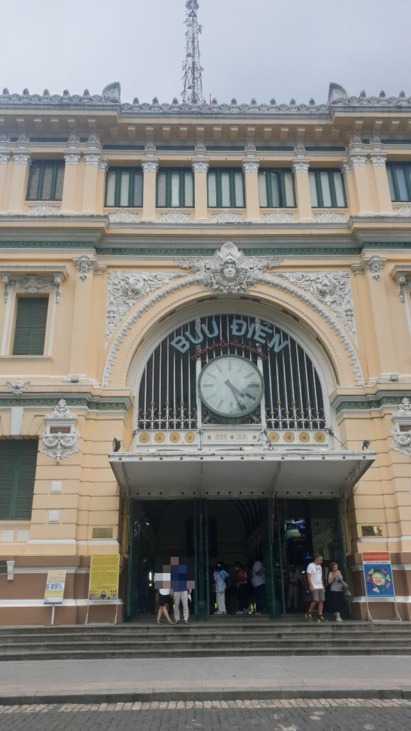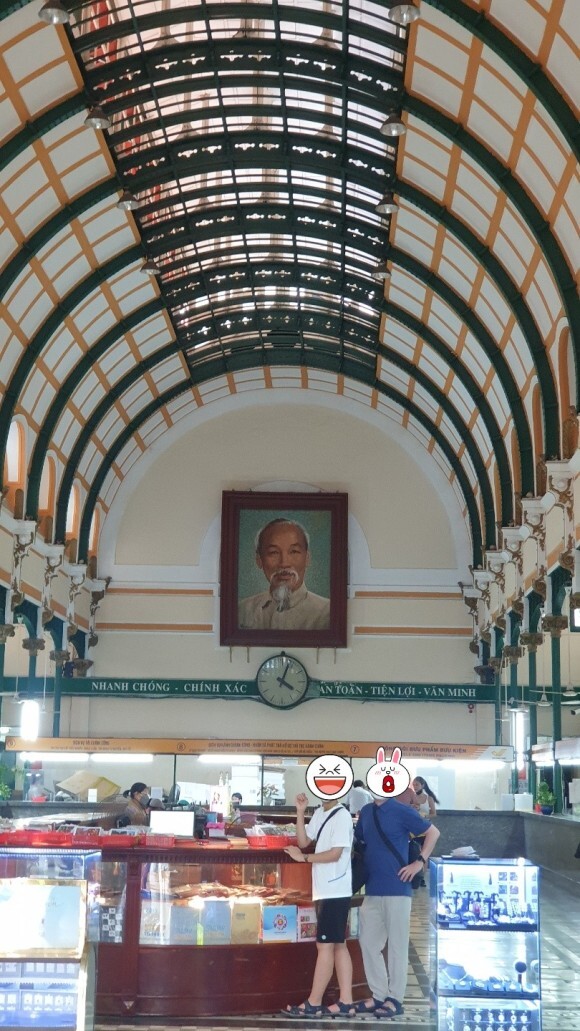 걸어서 10분 거리 호치민 중앙 우체국 있습니다. 프랑스 식민지 시대에 지어진 고딕과 르네상스 양식의 건물입니다. 1866년부터 5년 동안 이곳에 지어진 노란색 외관은 포토스팟이라고 한다.