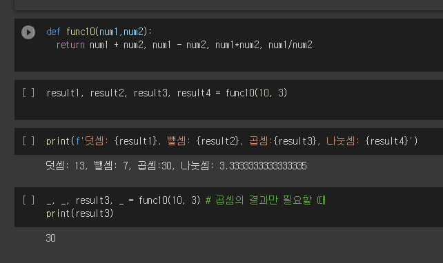 변수1, 변수2, ... = 함수명(변수1, 변수2...) #호출